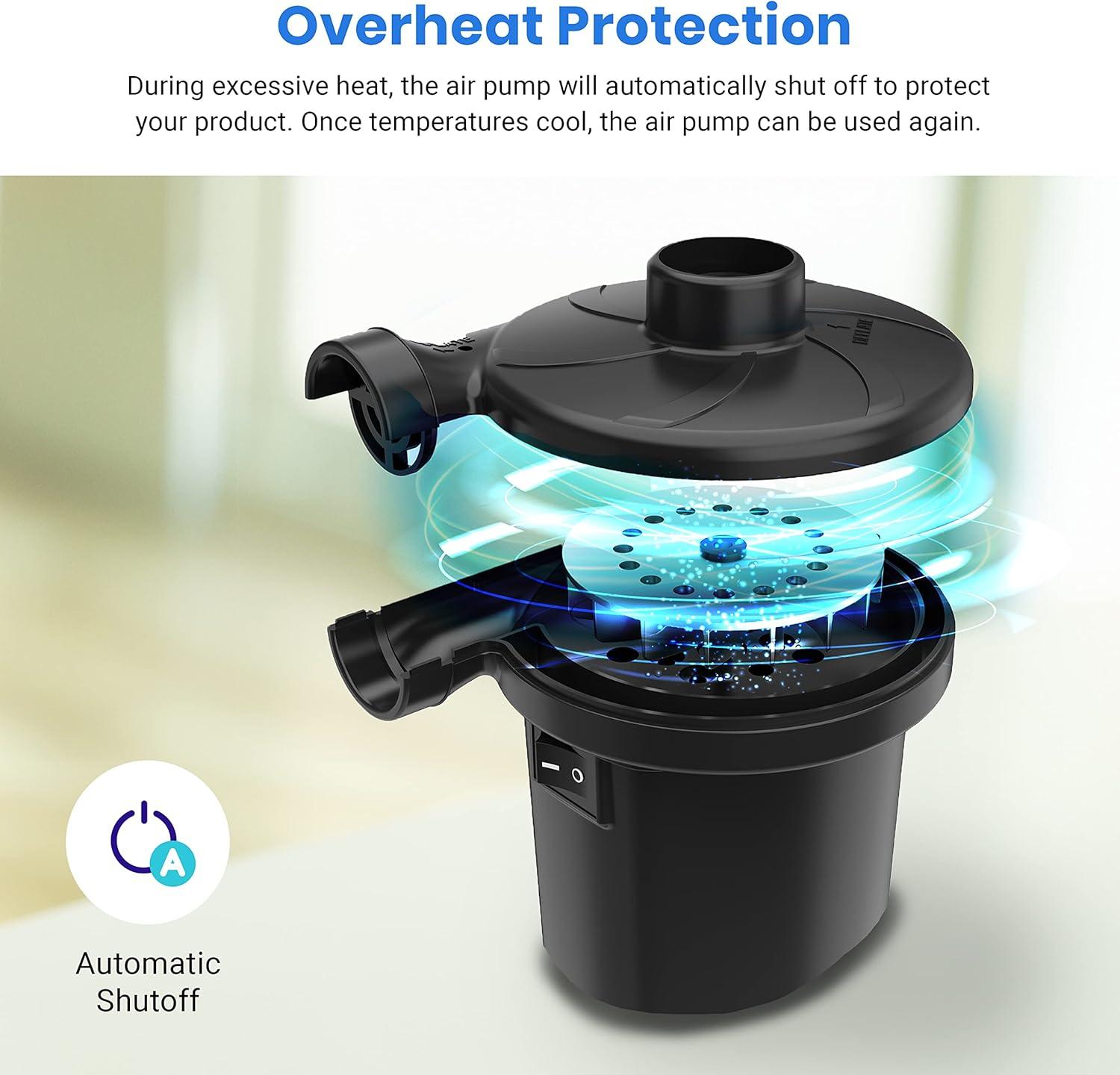 UNIQUE SOUND INSULATION DESIGN: This air pump uses an advanced wheel design and high-quality metal impellers, which greatly reduces its noise in operation; Great for last-minute mattress set-up when others nearby are already resting