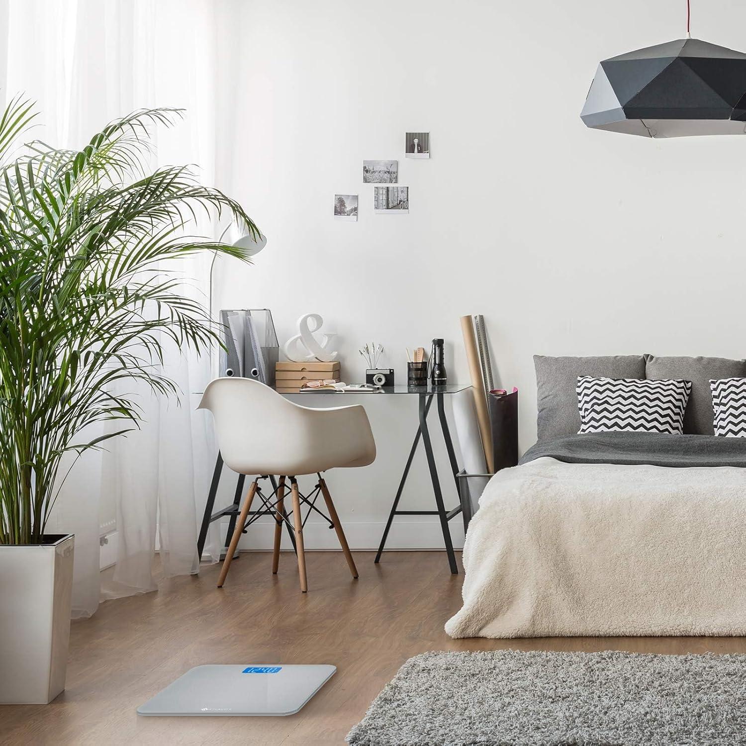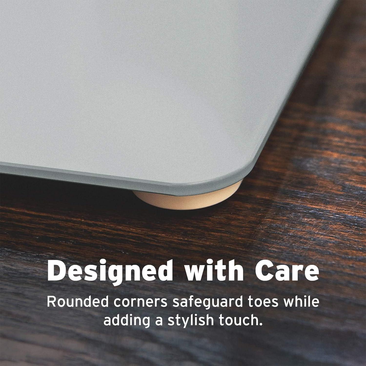 Sleek Design: This body weight scale’s modern, ash-grey design blends nicely with any style of living space. The rounded-corner design is also safer than sharp corners